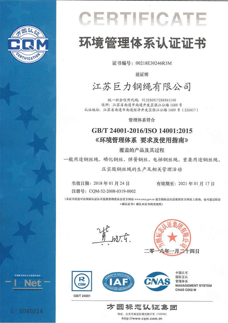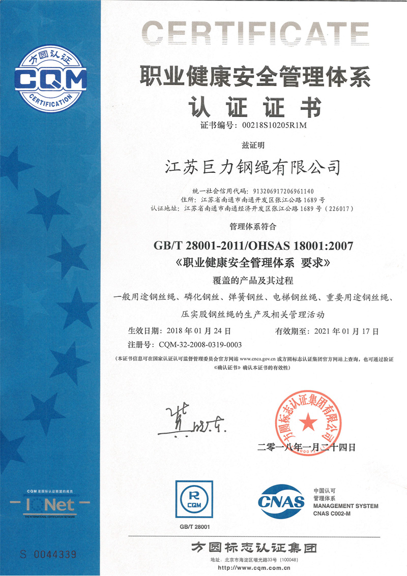 江苏巨力钢绳有限公司成立于1995年,坐落于国家级南通经济技术开发区,苏通大桥北桥头堡。占地面积15.2万平方米,注册资本6500万元。公司产品质量享誉全国。公司技术力量雄厚,2009年成立金属研究院,拥有一批技术骨干队伍,研发申报100多项专利。